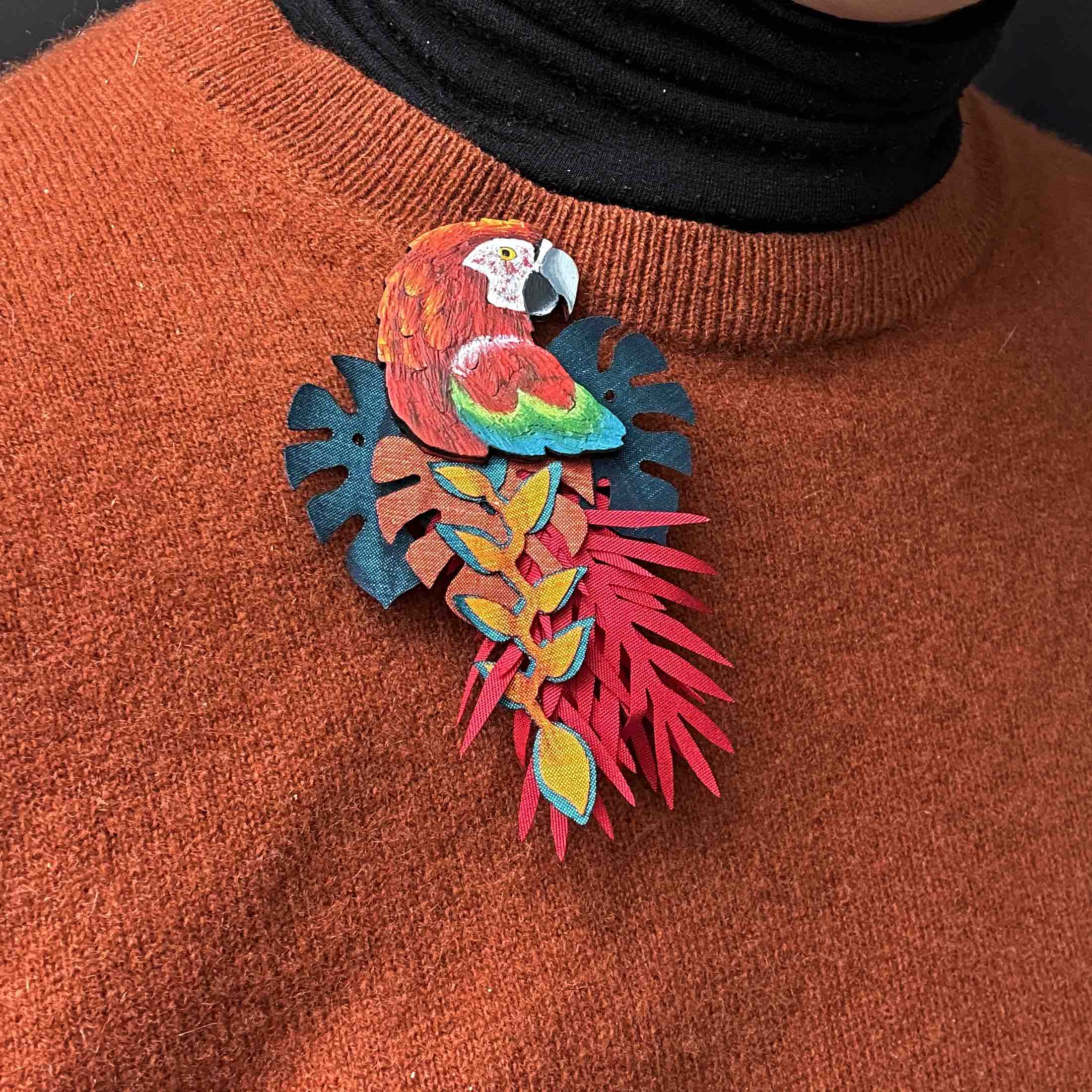 The Scarlet Macaw is a symbol of freedom, beauty, and vitality, with its fiery red feathers capturing the spirit of the tropical rainforest. This brooch showcases intricate hand-carved detailing layered over natural fabrics for depth, texture, and vibrant colour, making it an eye-catching accessory for jackets, scarves, bags, or dresses.