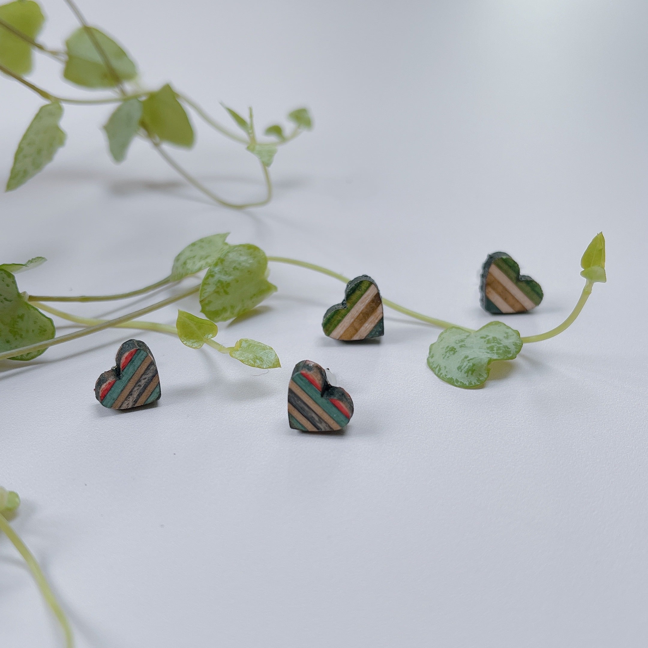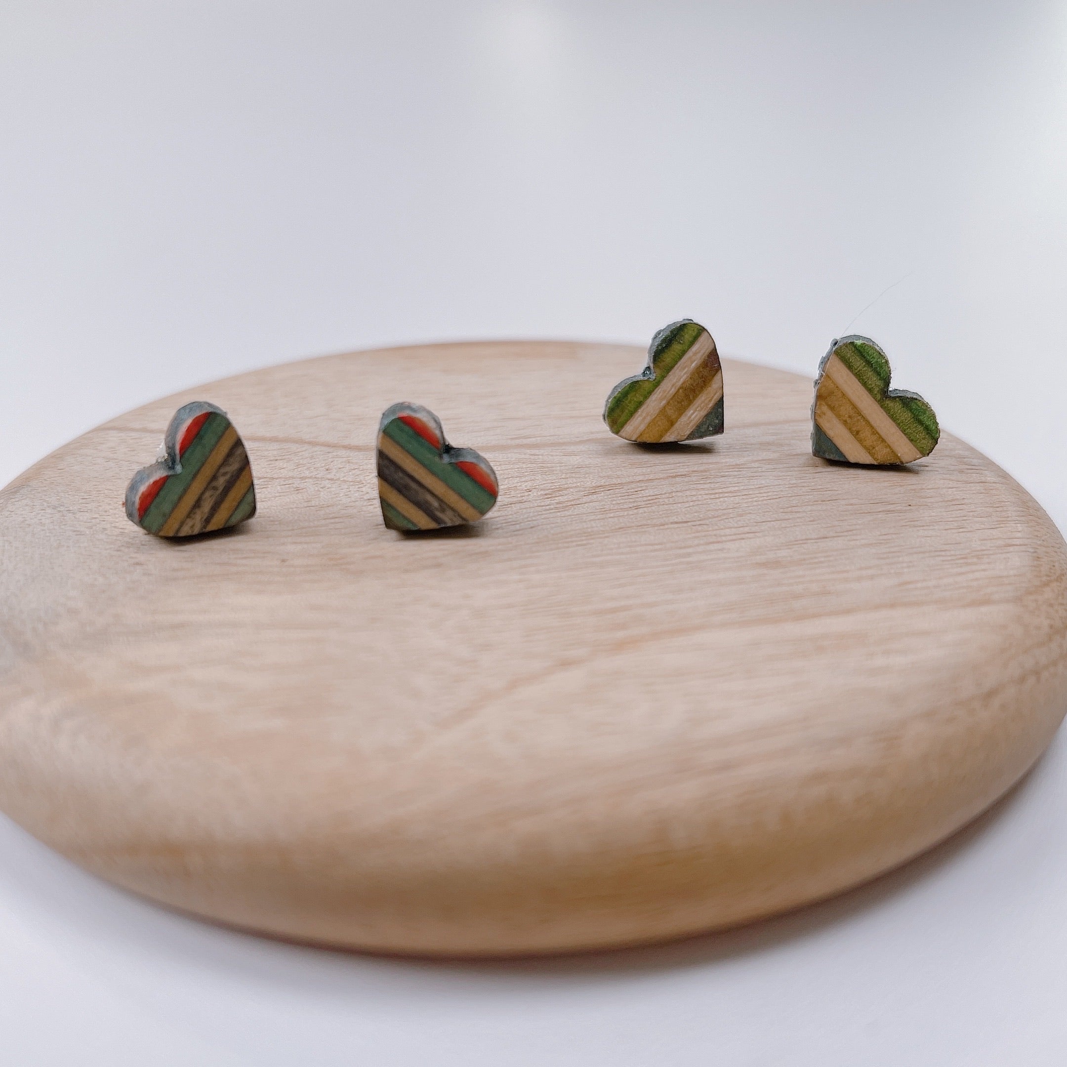 Love Heart Recycled Skateboard Wooden Stud Earrings by Paguro Upcycle